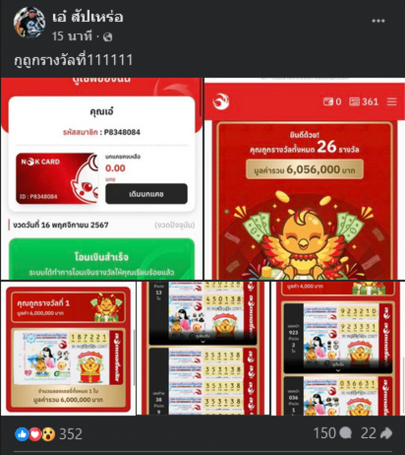 ต่อมา เอ๋ เชิญยิ้ม ก็ได้โพสต์ภาพและข้อความระบุว่า กูถูกรางวัลที่111111